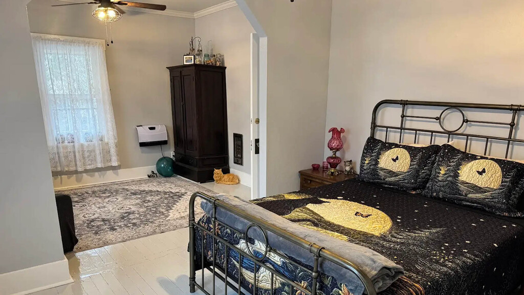 Named for a young lady who was our first guest after we built our first Bed and Breakfast.  It's the purr-fect place to cuddle into bed for feline lovers of every kind.  Ceramic kitties adorn the space which features a seperate seating area and private bathroom.